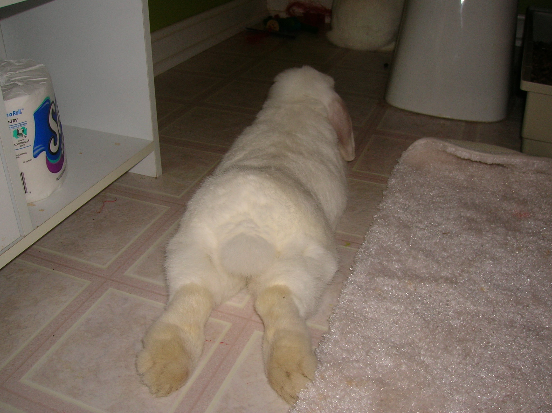 Here are some pictures of my Benny (lop) and his new mate Snowy. They are fully bonded and so sweet together. I have now moved them into Benny's room where they have their own bedroom all to themselves. How devoted and loving they are. Couldn't resiste a picture of Benny's rear, how cute is that? Big bunny feet and a snowball tail.