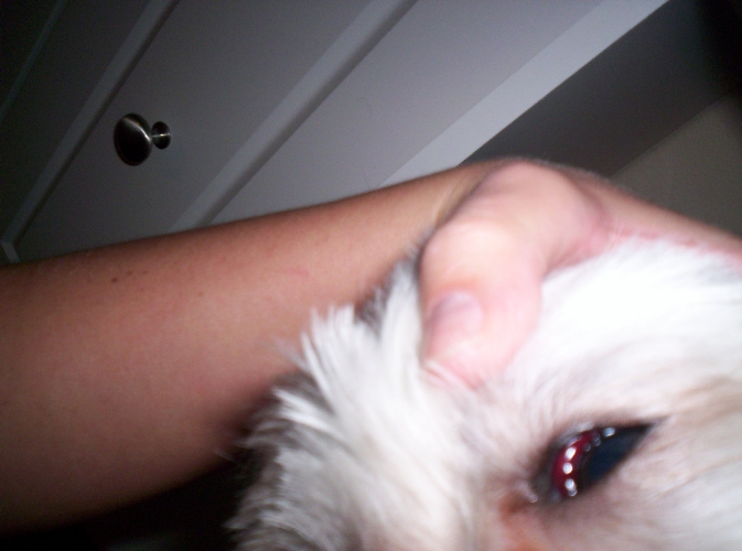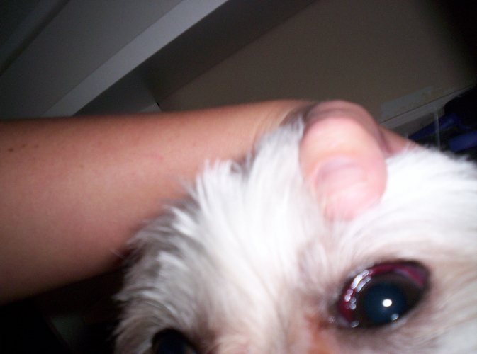 My cousin called me about her Maltese, Chewy. He had just gotten home from the groomers and his eye was very red and bulging she said. I asked her to send me some pictures, because it sounded like cherry eye but I don't think it is now.