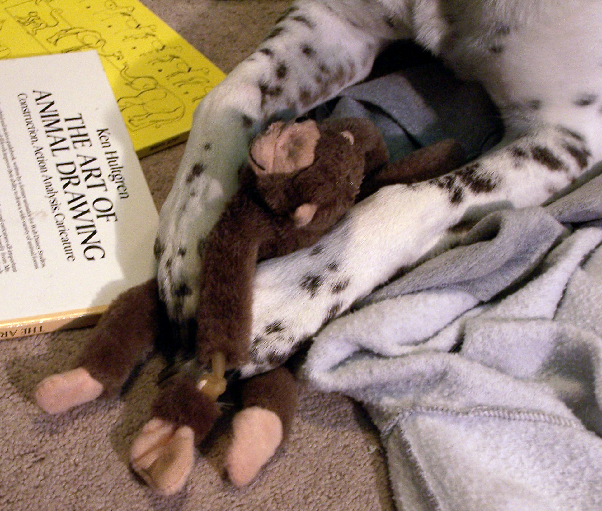 In a corner was a mature boxer. He had been brought in two days ago, and was already trained and sported neatly done cropped ears and a docked tail. He was surrendered by a family who expected the ten-year-old girl to be his primary caregiver. Spike was large and bold. He was a nice match for our family, and after much thought, and begging to take both dogs home, the final decision was given to me. Spike was my decision. My step-father signed the papers and left to make a previous engagement, while my mother, sister, and I were left to fill out the rest of the applicaion. Upon leaving, my step-father was almost knocked over by Spike. While my mother was filling out the form, I could not stop thinking of the little spotted dog. (who I then learned was called Nino) Karen had said he had been there for three weeks, long enough to be neutered and healed already. Spike was pure bred, trained, and had just gotten there. Surely someone would want him more. I turned to my mother and told her to stop, we were getting Nino instead. She agreed, our first dog had been too large and pushy, why take another chance? So against my step-father's knowledge, we changed the papers and took the Nino dog home that night.