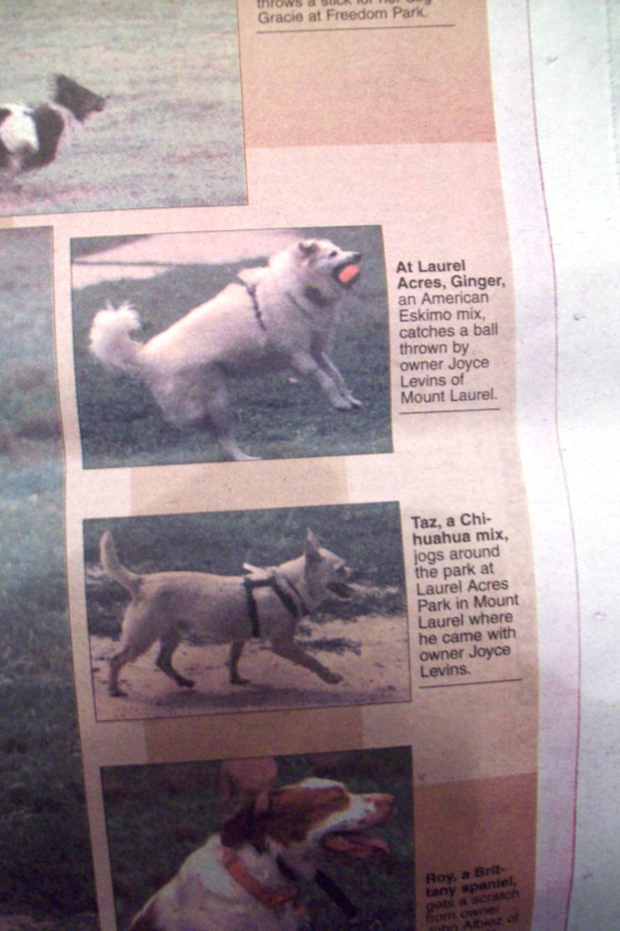Well not exactlly the newspaper, but the Friday afternoon inset about what is going on this weekend.There is an article on dog parks, and last weekend, Ginger and Taz were photographed while they were playing at the local park. Unfortunately it isn't online so I can't link it here. But I just wanted to brag a little any way. Now I am bugging all of my co-workers for their copies of the What's Happening.