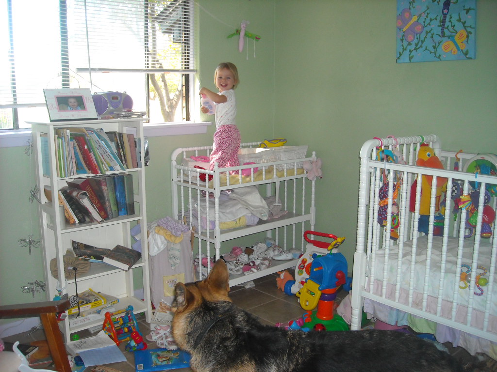 Please, please excuse the mess in Quinn's room. I clean it and put the books back on the bookshelf, and put her dirty clothes back in her hamper, but she pulls books off the bookshelf and pulls her dirty clothes out of the hamper nearly the moment I fix them and she's got it destroyed in about 1/2 hour again. I usually pick it up every night before bed so she's had the morning to destroy it again.