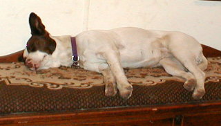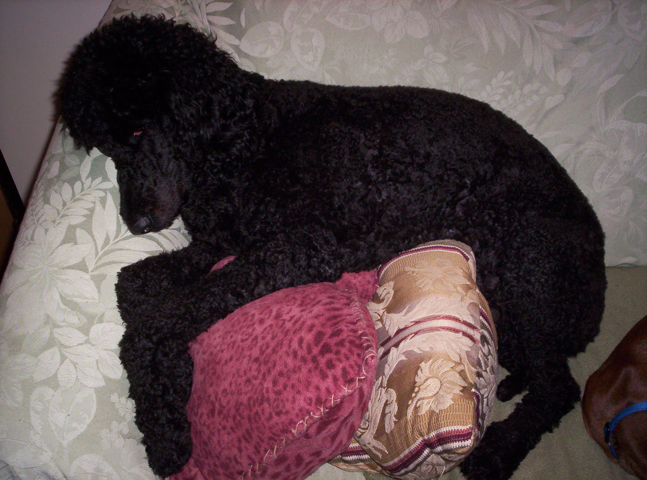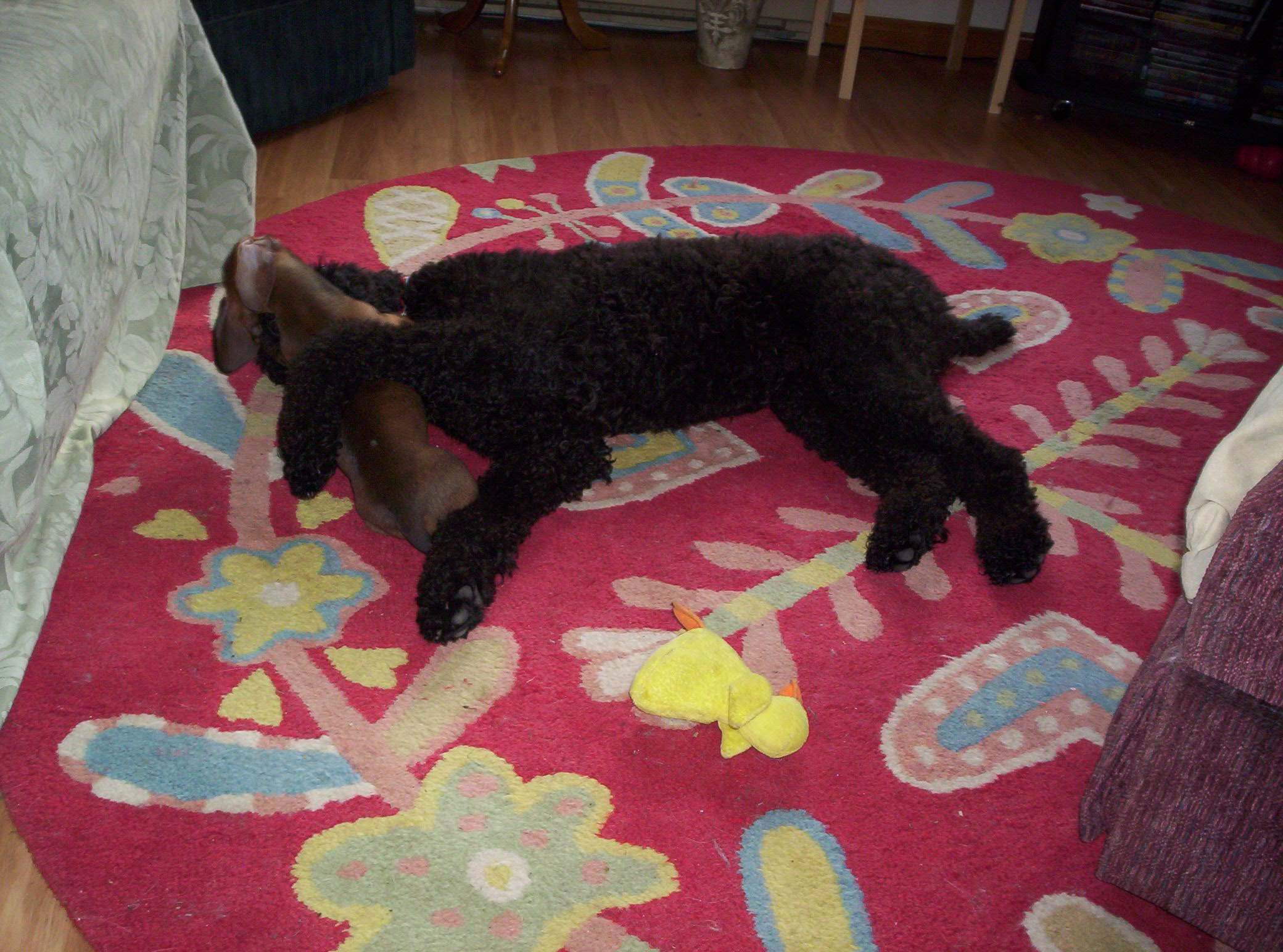 Bella and Bodea, curly doggies, I'd love to give you a widdle kissie! Sunny and Hank, what cute puppy sleepers you are! Cassie, I love your frog leg puppy picture AND your comfortable adult picture. Everybody --- you are all so flexible! Great thread!