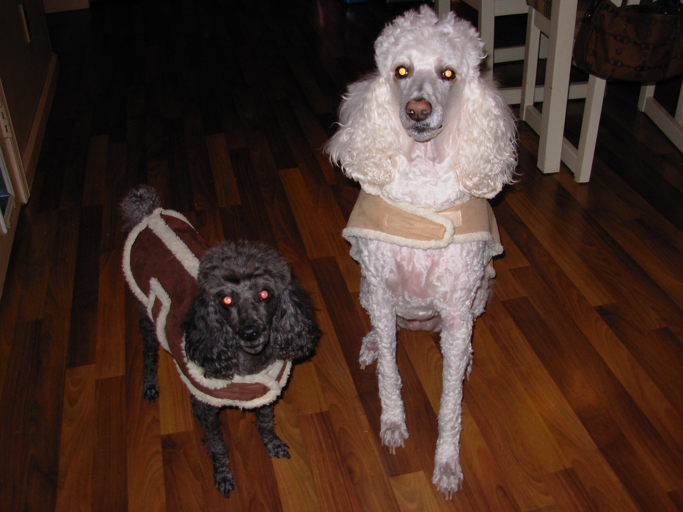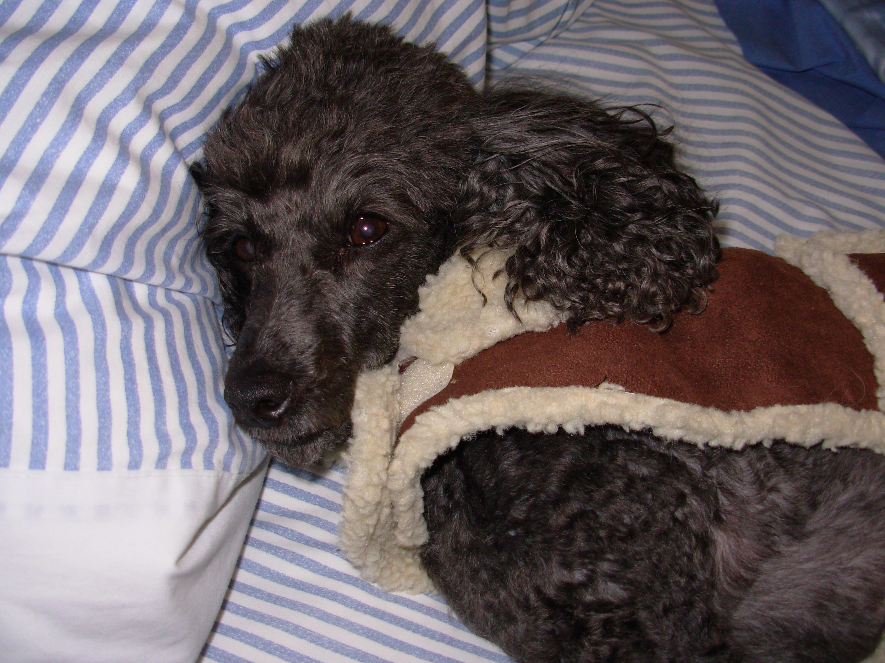 Well it was earlier this morning. I put the dogs' coats on them for their first outing of the morning and decided to snap a picture or two. After they came back in Ripley ran right back up to bed again.I thought he was so cute all cuddled up with his coat on that I had to crawl back into bed with him for a little while myself.