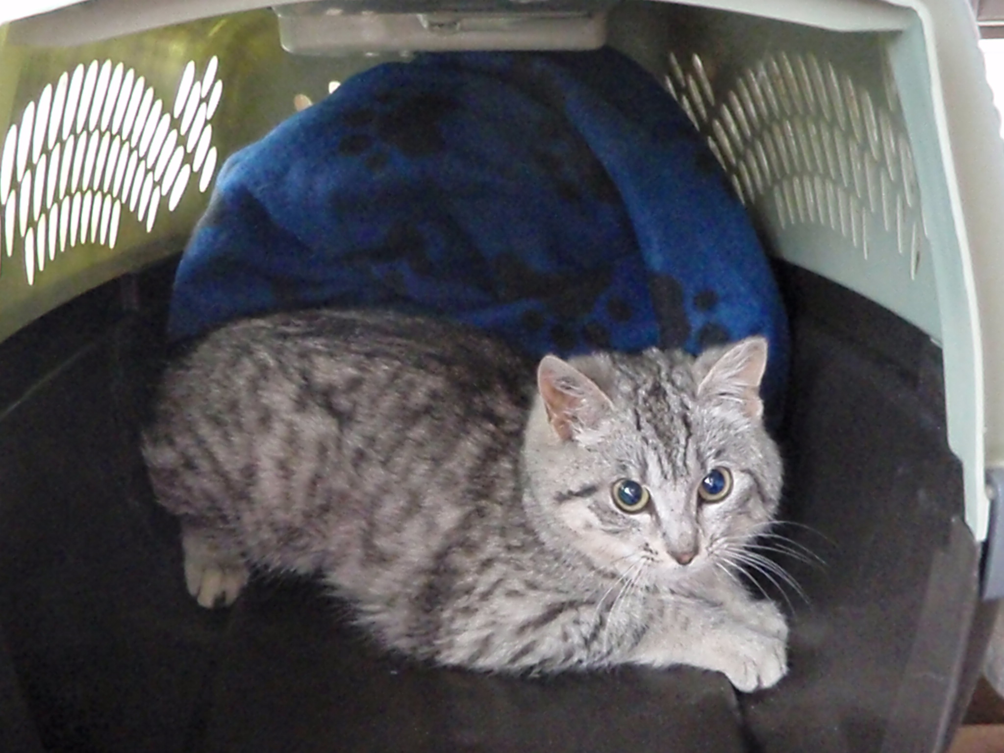 Oh, oh, major excitement. She's come out of the carrier!!!! Mind you, she's hiding among other stuff in the garage, but she came out. She also ate the 3 little whiskas temptations I gave her when we first got home. Hasn't eaten any food yet or used the litter box, but she's out and about.