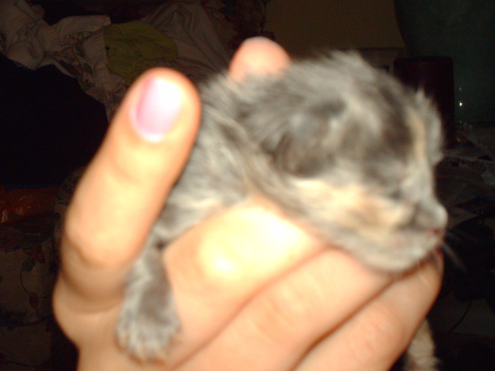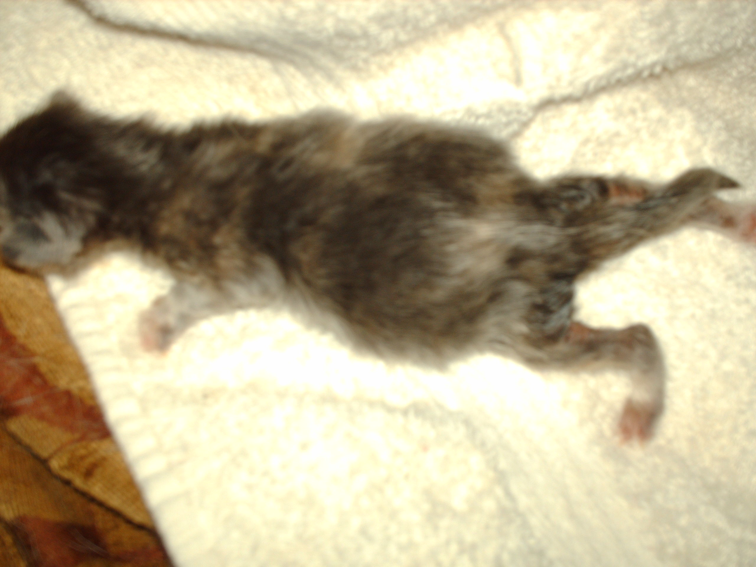 Recently, I heard a small kitten meowing outside of my house, in the back yard. I went outside and hunted it down, and it is a VERY young kitten, umbilical cord was still attached when I found her, so only a few days old. It appears she was abandoned, or perhaps the mother rejected her? I'm not positive, but I couldn't leave her outside to wait and see if the mother was perhaps relocating a litter. It took me about 45 minutes to find her underneath the shed, and as I live in Tennessee, it is sweltering hot at this time of year and very humid. I didn't think she would be able to last without dehydrating out there.