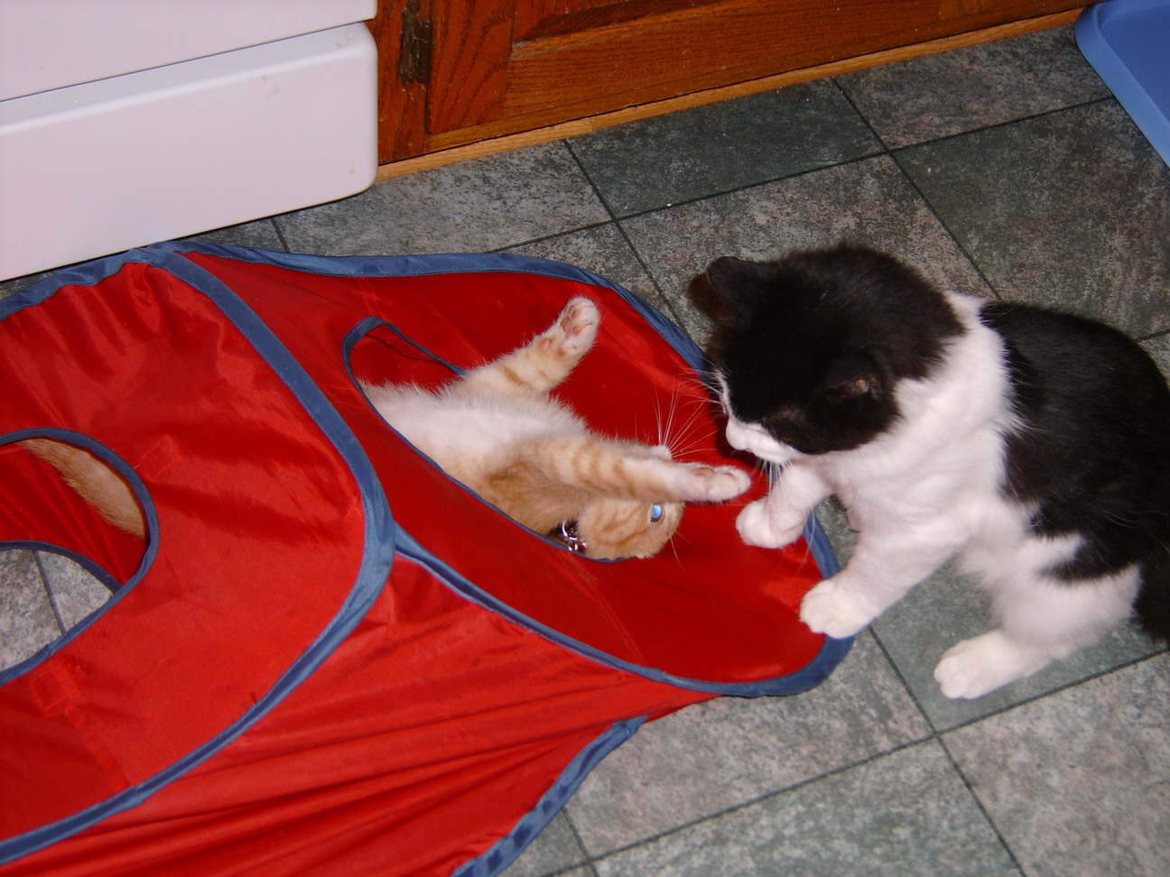 I am trying to remember the name of the Little Tuxedo whos checking out his New Pal!!!