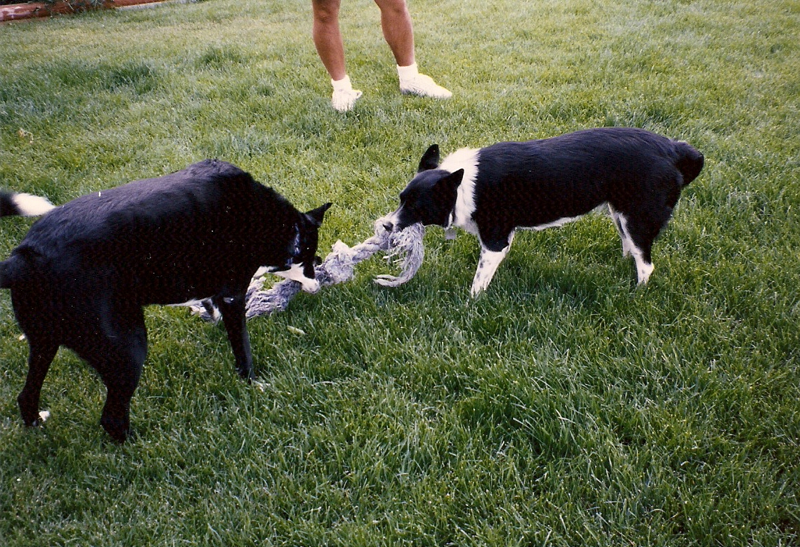 The two dogs with the rope are Sami and Sasha. You all know Sasha well and you know she just left in October. Even though she weighed 20 lbs less than Sami she put up a mighty tug of war effort.