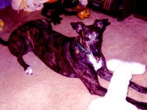 The first greyhound we ever owned, her name was Gracie. Her trainer from the track kept in close contact with us- Gracie would go CRAZY happy when she saw him at Greyhound events.