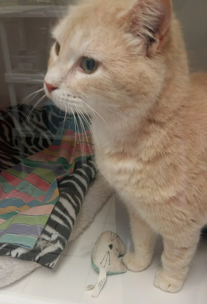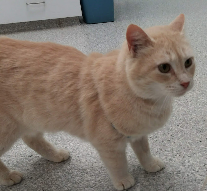 Currently she is living at the hospital, waiting for her forever home. She is the most social and loving cat I have met in a long time. I take her for walks in the hospital, and she prances around like she owns the place.