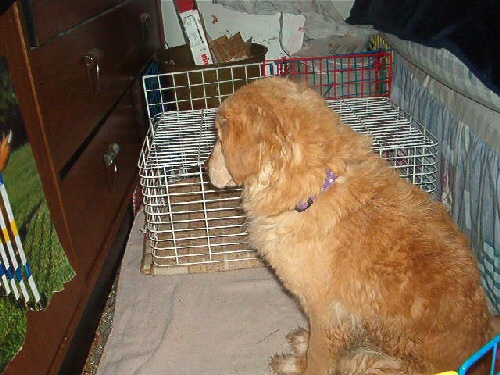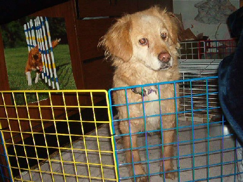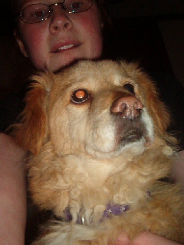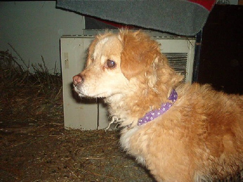 lol you cant really tell in the pics but her face is sort of poodley and her coat is slightly curly, her ears are very much golden retriever, but her tail fully curls over her back, he face mostly only look odd in the pics because she is severly undershot. my mom is calling her a golden retriever right now because of the breeder number, we are only guessing goldendoodle as she looks like most goldendoodles around here lol